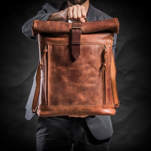 Travel Camping Trekking Backpack Genuine Leather Rolling Top Bag Custom Embossed Logo Large Capacity Bags